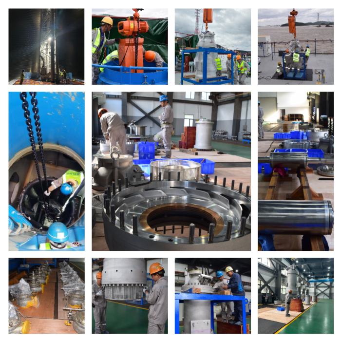 此次修理主要涉及塢內(nèi)冰區(qū)漆涂裝,推進(jìn)系統(tǒng)、絕緣層安全閥及低溫液貨維護(hù)系統(tǒng)等核心設(shè)備檢修,主要包括主推進(jìn)器、發(fā)電機(jī)檢修,4個液貨艙開艙檢查,貨艙液貨泵、燃?xì)獗貌饳z,低溫閥及貨物壓縮機(jī)檢修等。特別是液貨泵的離船檢、修、拆、換,作為精密設(shè)備,全程進(jìn)行了嚴(yán)格保護(hù)。